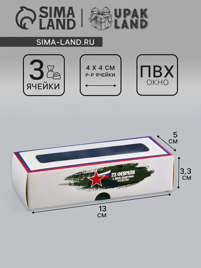 Коробка с обечайкой для 3 конфет, с окном «23 Февраля», 13×5×3.3 см