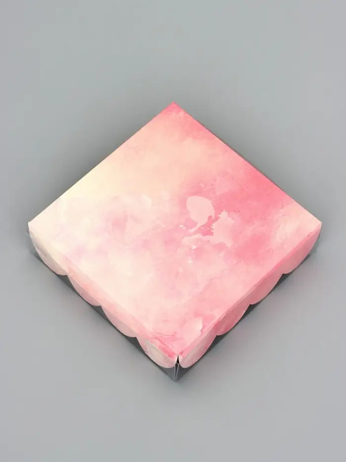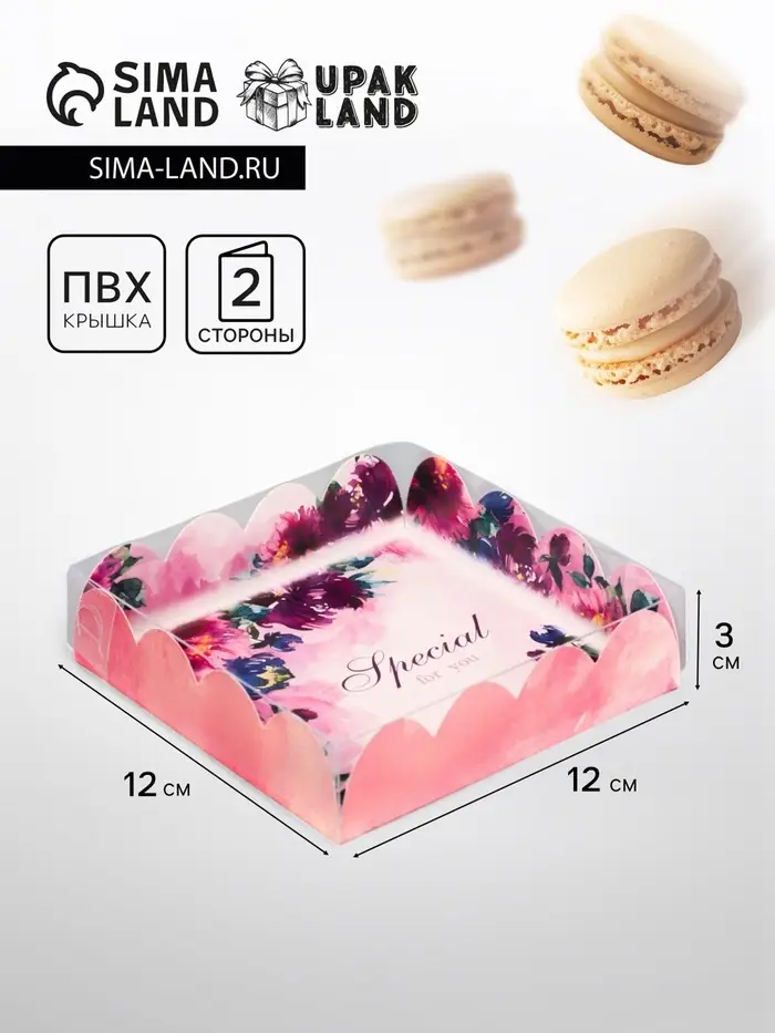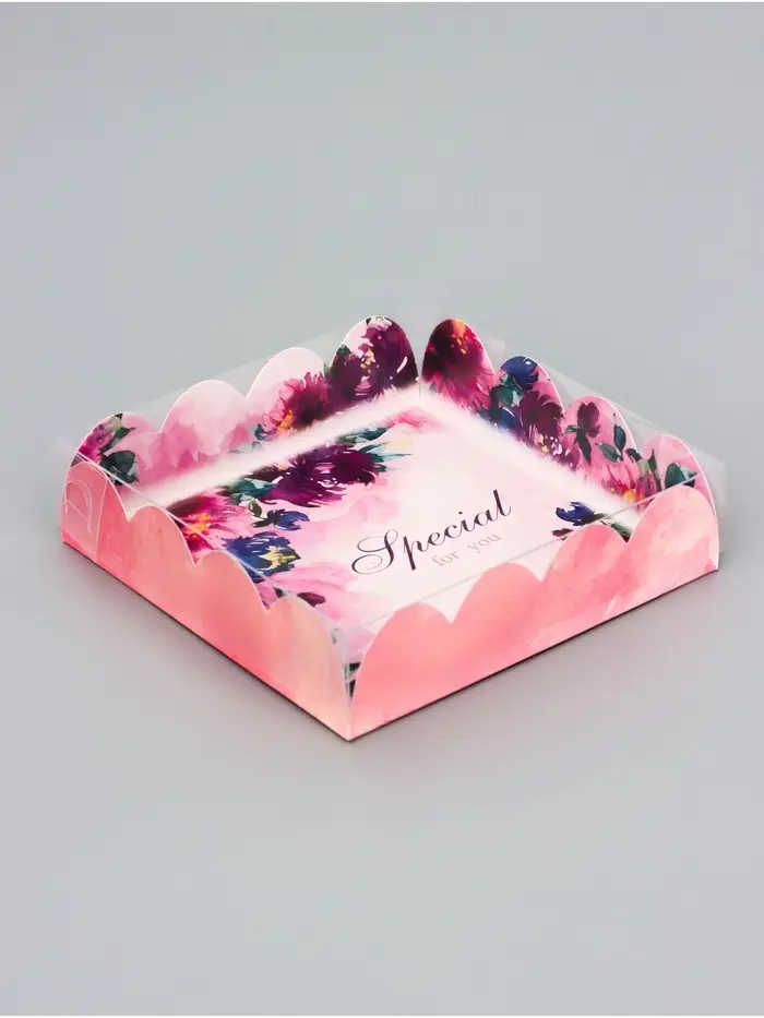 Прочный картон обеспечивает надежную защиту содержимого, а прозрачная крышка позволяет сразу оценить внешний вид угощений без необходимости открывать коробку.