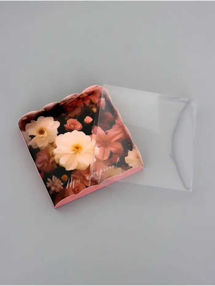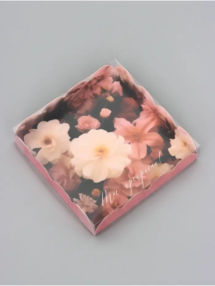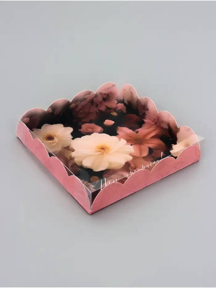Прочный картон обеспечивает надежную защиту содержимого, а прозрачная крышка позволяет сразу оценить внешний вид угощений без необходимости открывать коробку.