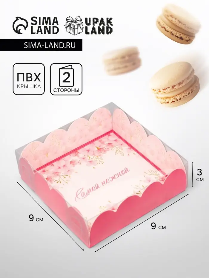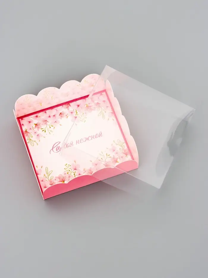 Прочный картон обеспечивает надежную защиту содержимого, а прозрачная крышка позволяет сразу оценить внешний вид угощений без необходимости открывать коробку.