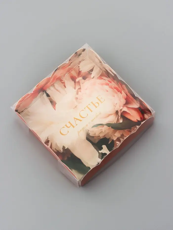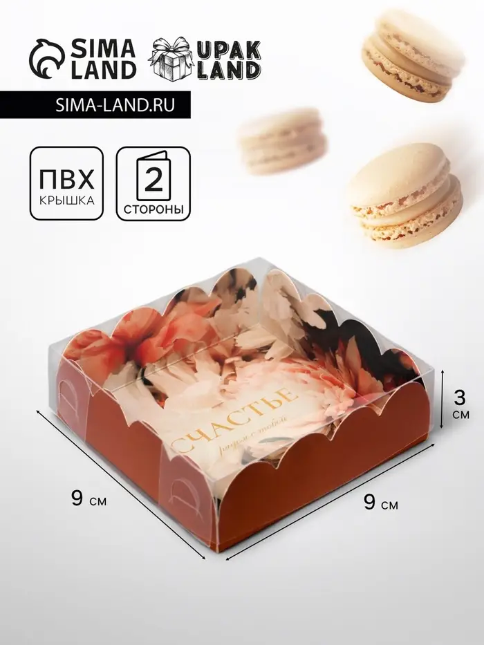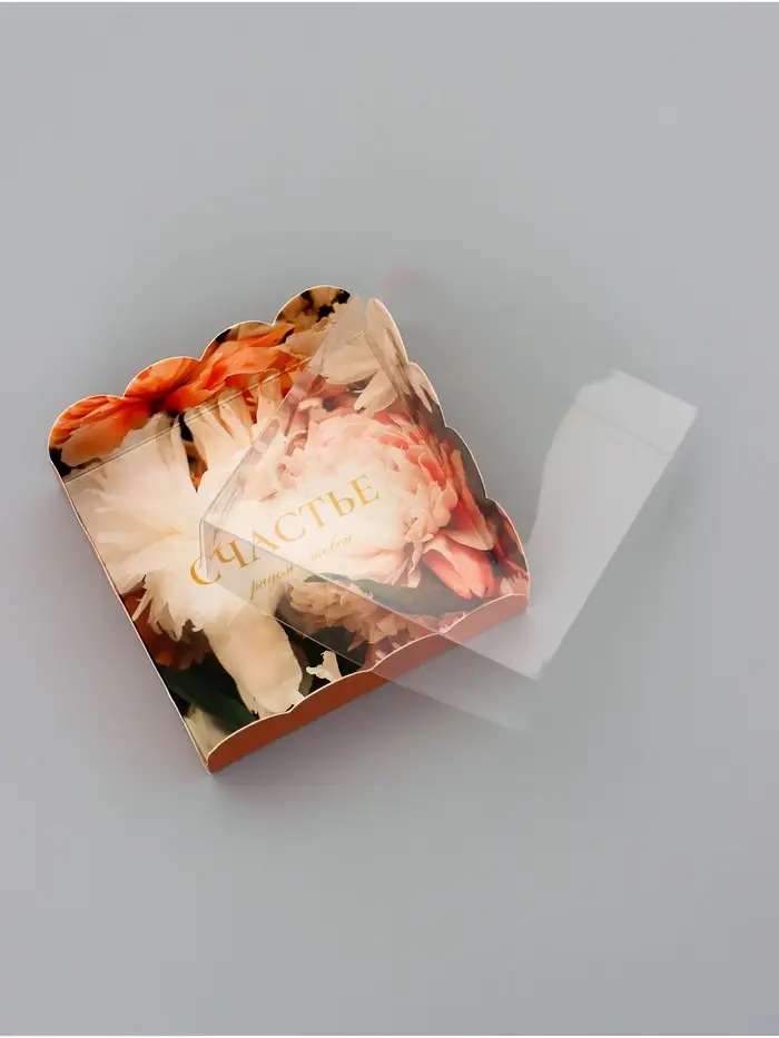 Прочный картон обеспечивает надежную защиту содержимого, а прозрачная крышка позволяет сразу оценить внешний вид угощений без необходимости открывать коробку.