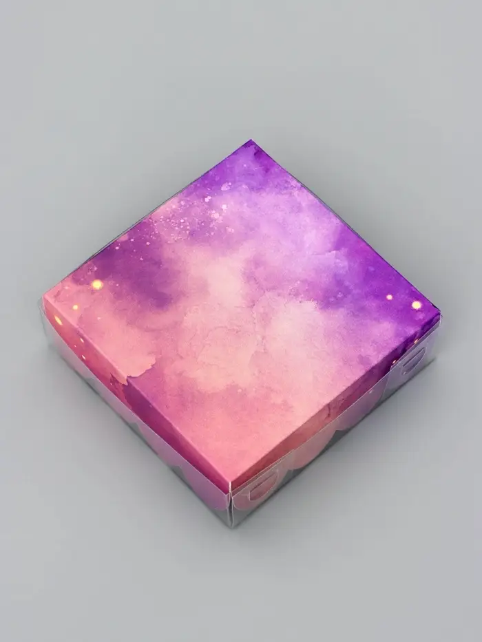 Прочный картон обеспечивает надежную защиту содержимого, а прозрачная крышка позволяет сразу оценить внешний вид угощений без необходимости открывать коробку.