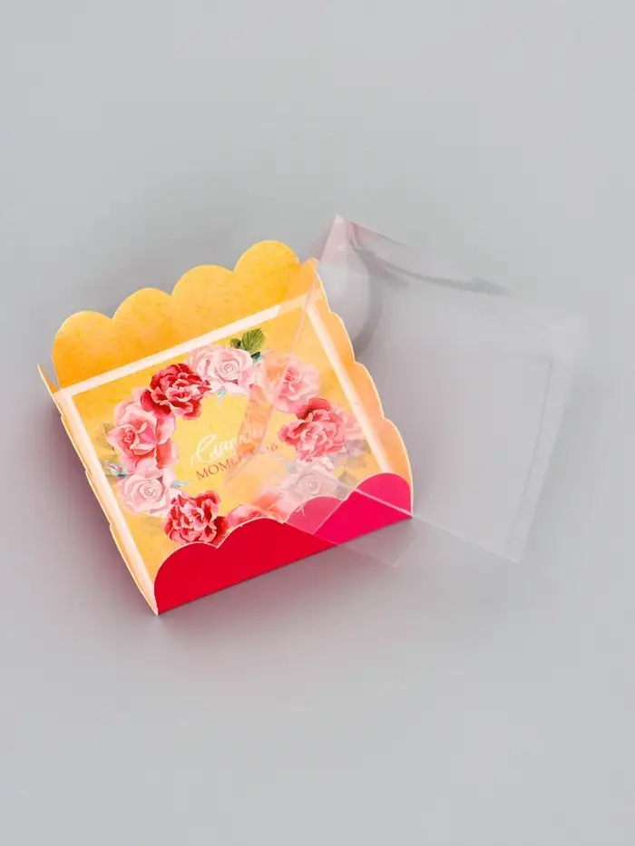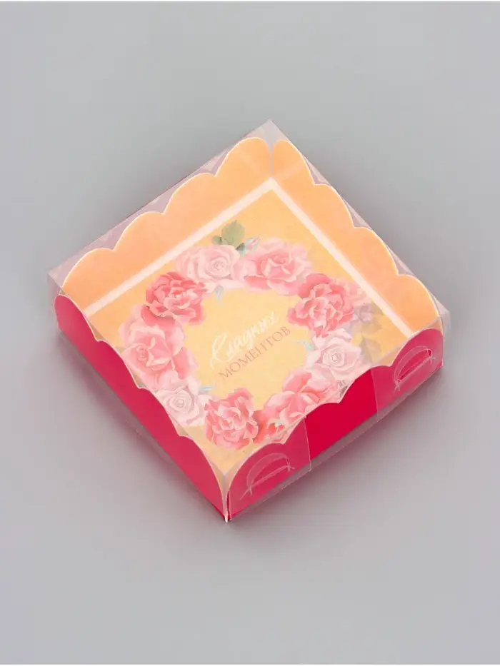 Прочный картон обеспечивает надежную защиту содержимого, а прозрачная крышка позволяет сразу оценить внешний вид угощений без необходимости открывать коробку.