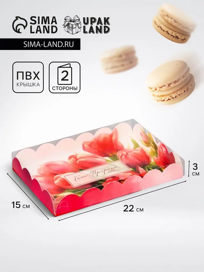 Прочный картон обеспечивает надежную защиту содержимого, а прозрачная крышка позволяет сразу оценить внешний вид угощений без необходимости открывать коробку.