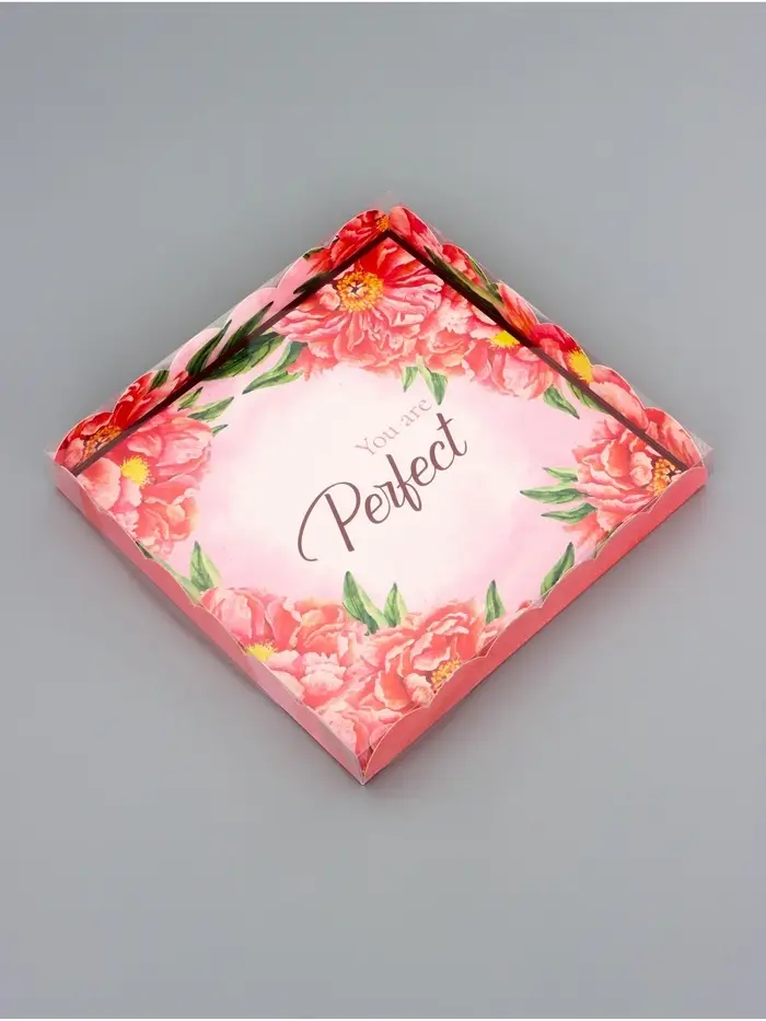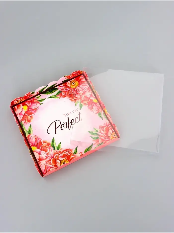 Прочный картон обеспечивает надежную защиту содержимого, а прозрачная крышка позволяет сразу оценить внешний вид угощений без необходимости открывать коробку.