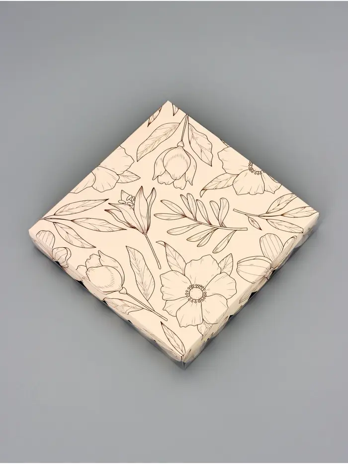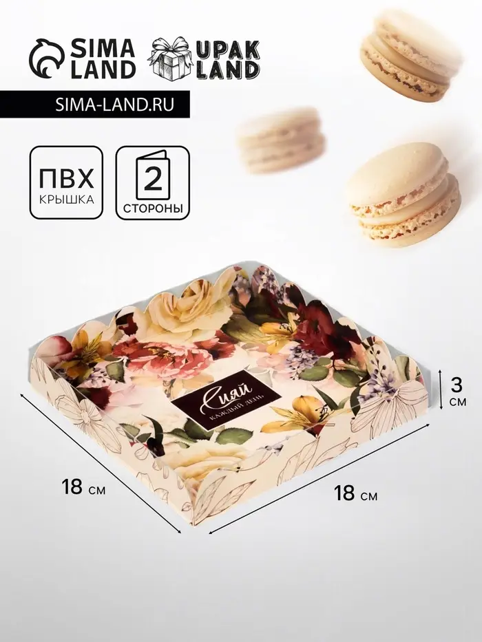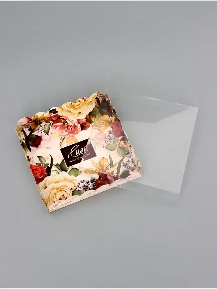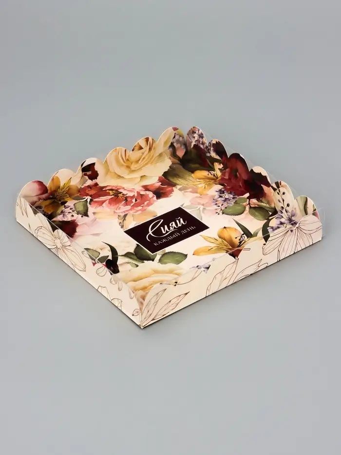 Прочный картон обеспечивает надежную защиту содержимого, а прозрачная крышка позволяет сразу оценить внешний вид угощений без необходимости открывать коробку.