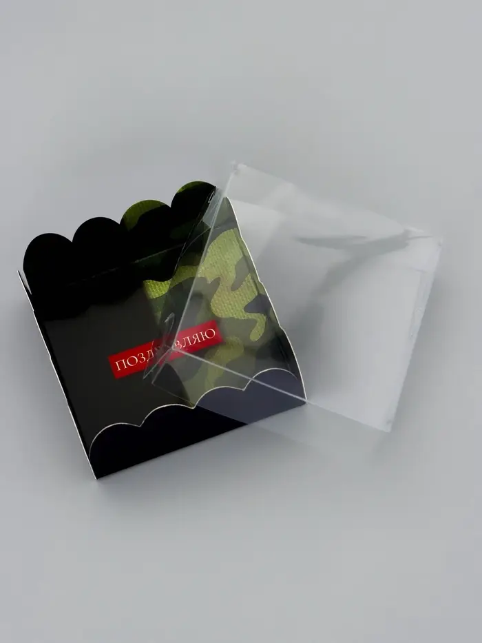 Прочный картон обеспечивает надежную защиту содержимого, а прозрачная крышка позволяет сразу оценить внешний вид угощений без необходимости открывать коробку.