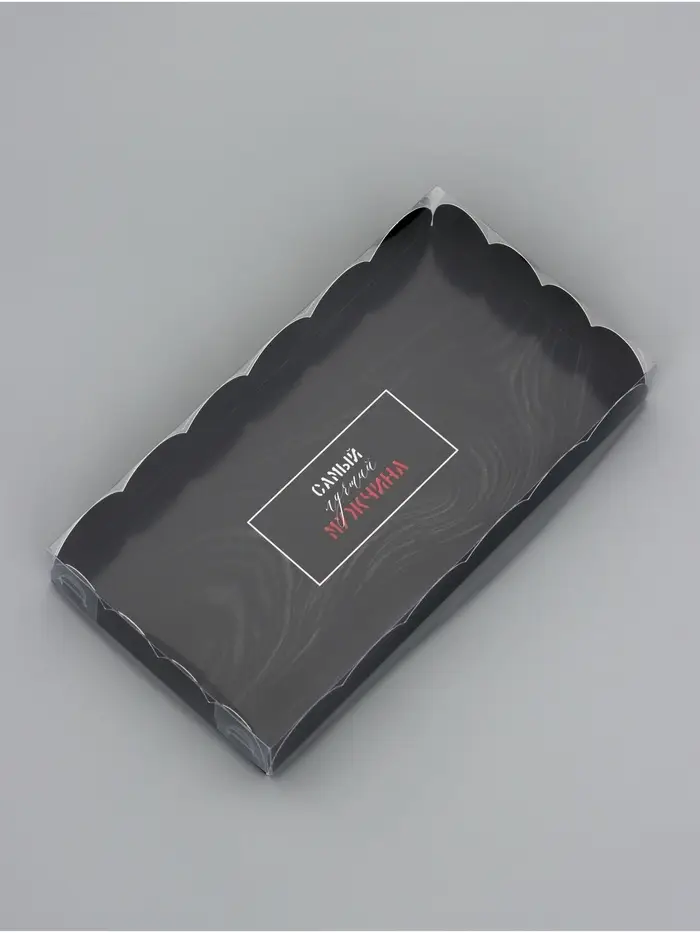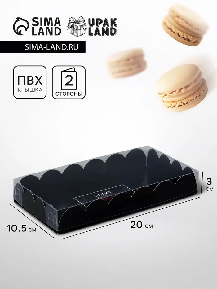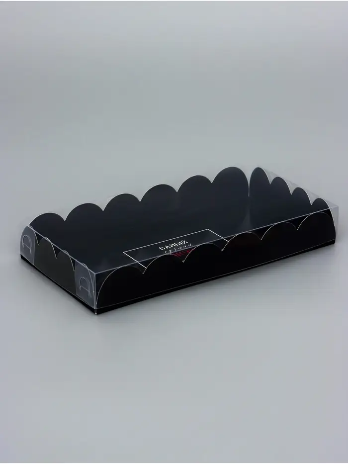 Прочный картон обеспечивает надежную защиту содержимого, а прозрачная крышка позволяет сразу оценить внешний вид угощений без необходимости открывать коробку.