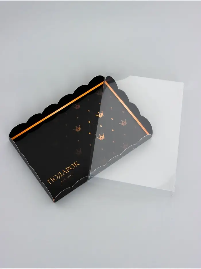 Прочный картон обеспечивает надежную защиту содержимого, а прозрачная крышка позволяет сразу оценить внешний вид угощений без необходимости открывать коробку.