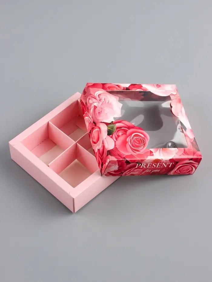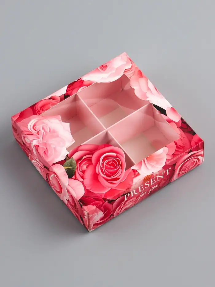 - Размер 12,6 х 12,6 х 3,5 см подходит для упаковки 4 конфет или небольших десертов.