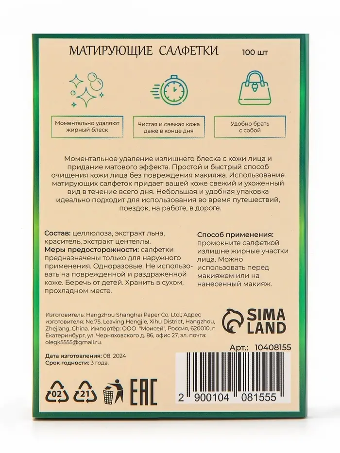 Матирующие салфетки Secret Beauty, 100 шт., зелёные