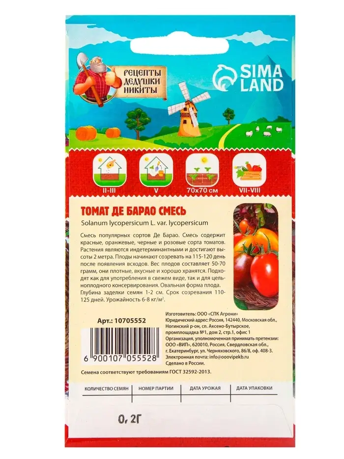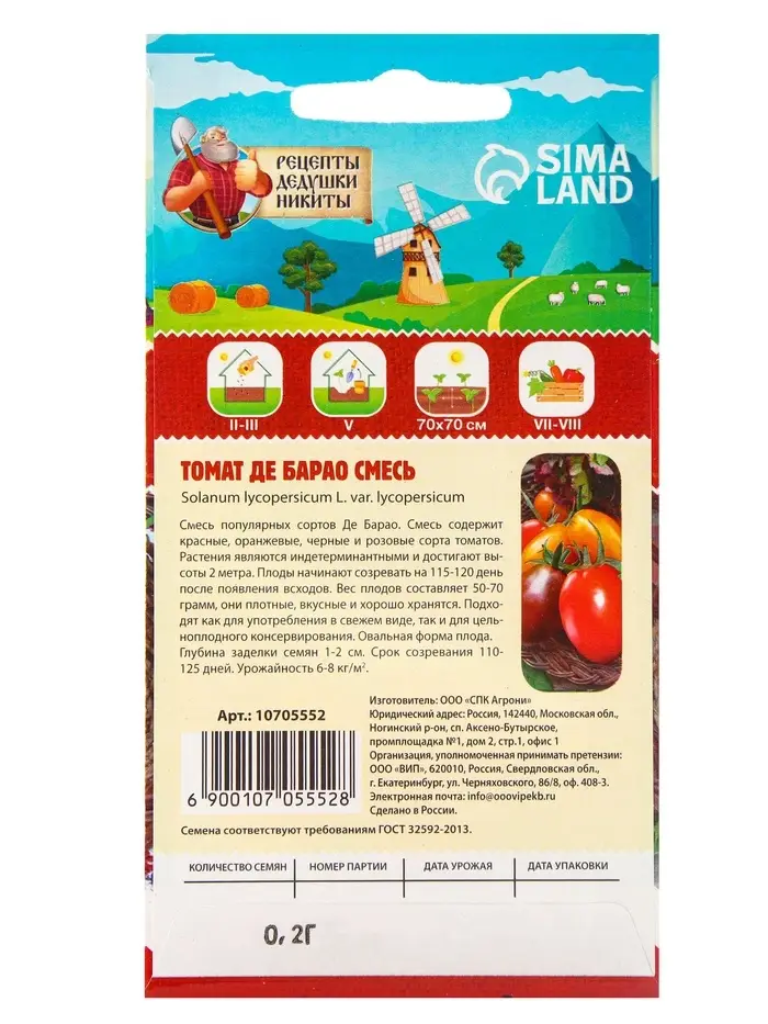 Семена Томат Де Барао — это уникальная смесь сортов, которая порадует любого огородника богатым урожаем и разнообразием вкусов. Этот гибрид выделяется своей неприхотливостью и универсальностью: его можно выращивать как в открытом грунте, так и в теплицах. Плоды отличаются яркими цветами — от насыщенного красного до желтого и розового, что делает их идеальными для свежих салатов, консервации и приготовления соусов. Вкус у томатов сладковатый с легкой кислинкой, что особенно ценится гурманами. Урожайность сорта впечатляет: с одного куста можно собрать до 5-7 кг плодов. Сроки плодоношения растянутые — томаты начинают созревать уже через 100-110 дней после посадки и радуют урожаем до самых заморозков. Растение устойчиво к основным заболеваниям томатов, таким как фитофтороз, а также легко переносит неблагоприятные погодные условия, включая дожди и засуху.
