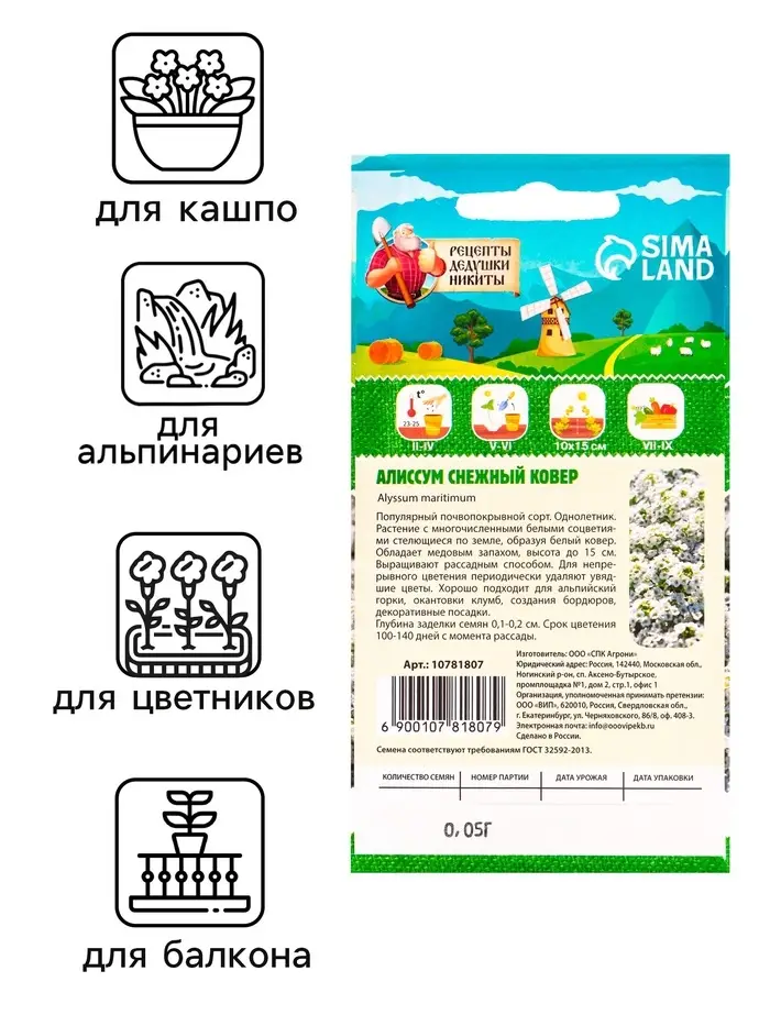 Представьте себе ваш сад, укутанный в пушистый белоснежный ковер, который источает тонкий медовый аромат и привлекает пчел и бабочек. Это не просто декоративное растение — это источник радости и уюта на вашем участке. Семена Алиссума Снежный ковер — это доступное, надежное и простое решение для создания неповторимого ландшафта. Не упустите возможность преобразить свой сад уже этим летом! Закажите семена прямо сейчас и сделайте первый шаг к садовой мечте.