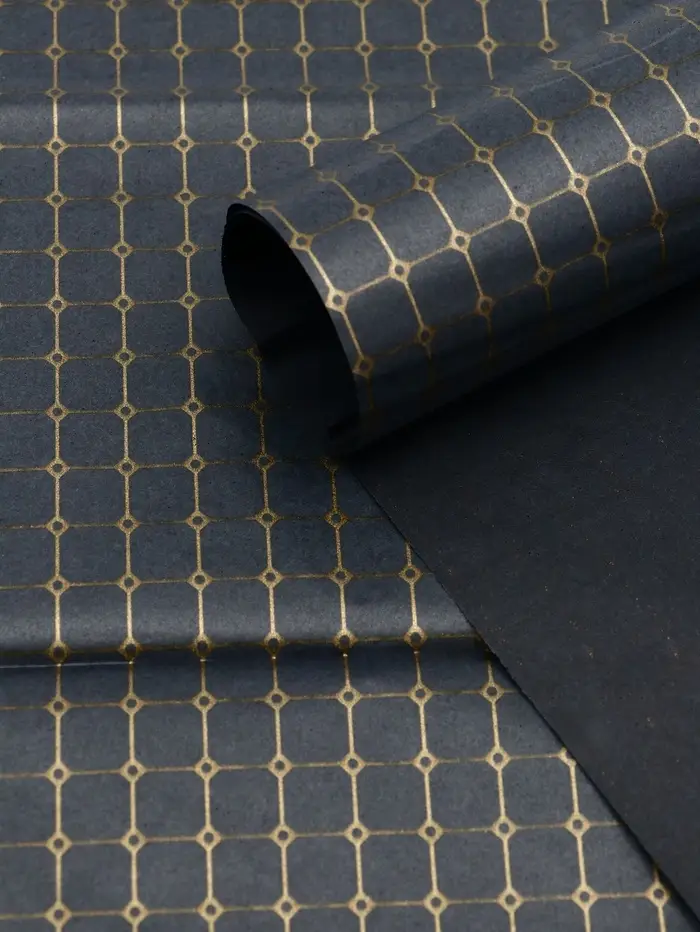 Упаковочная бумага «Шарм» в чёрном цвете — это стильный и универсальный материал для оформления подарков к любому празднику. Её геометрический узор в виде клетки с золотистыми акцентами добавляет подарку изысканности и современности, а чёрный цвет делает её нейтральной и подходящей для любого повода.