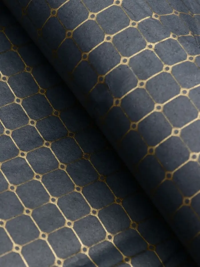 Бумага сочетает в себе минимализм и роскошь. Её лёгкая текстура позволяет легко оборачивать подарки, а геометрический узор с золотистыми элементами добавляет изысканности. Это отличный выбор для тех, кто хочет сделать подарок запоминающимся и современным.