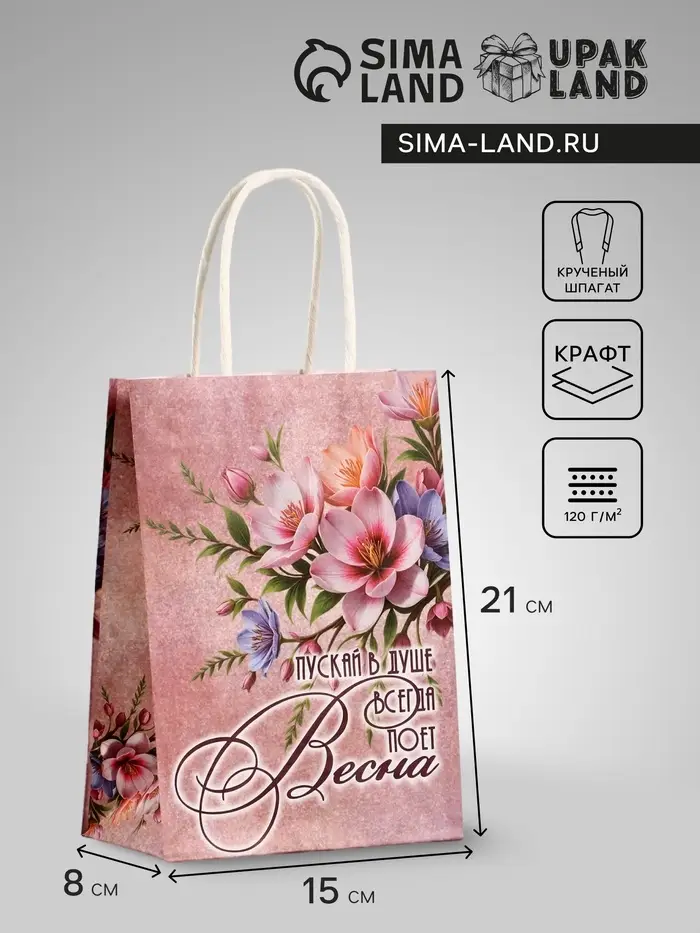 Пакет подарочный крафт, «Весна!», 15×8×21 см
