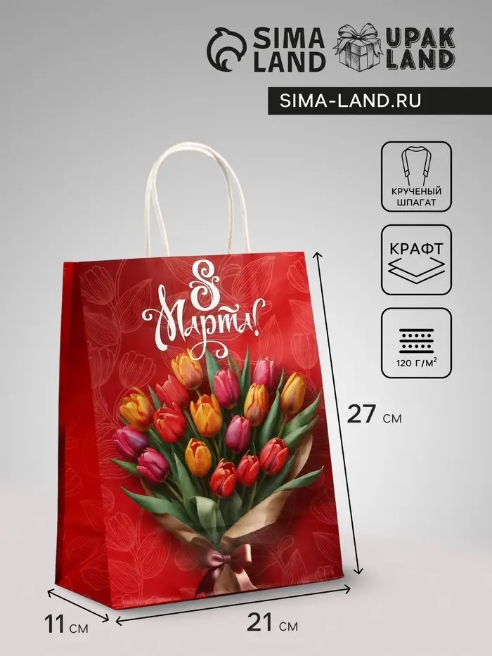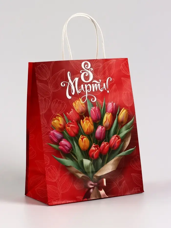 Пакет подарочный крафт, «8 Марта», 21×11×27 см