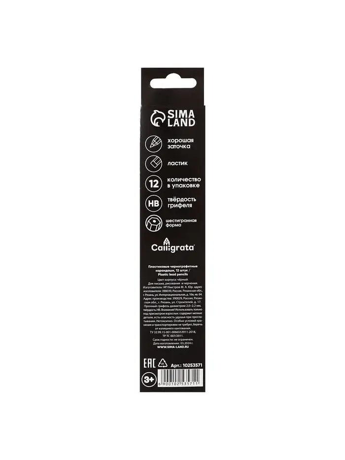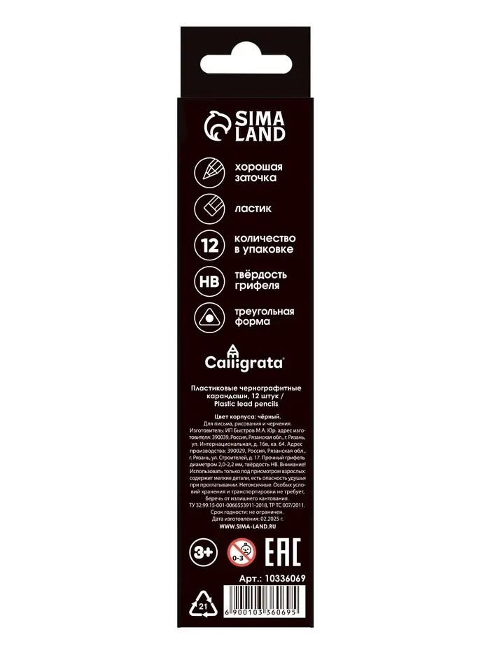 Набор карандашей чернографитных 12 штук, Calligrata Classic, с ластиком, заточенные, пластик, трехгранные, черные