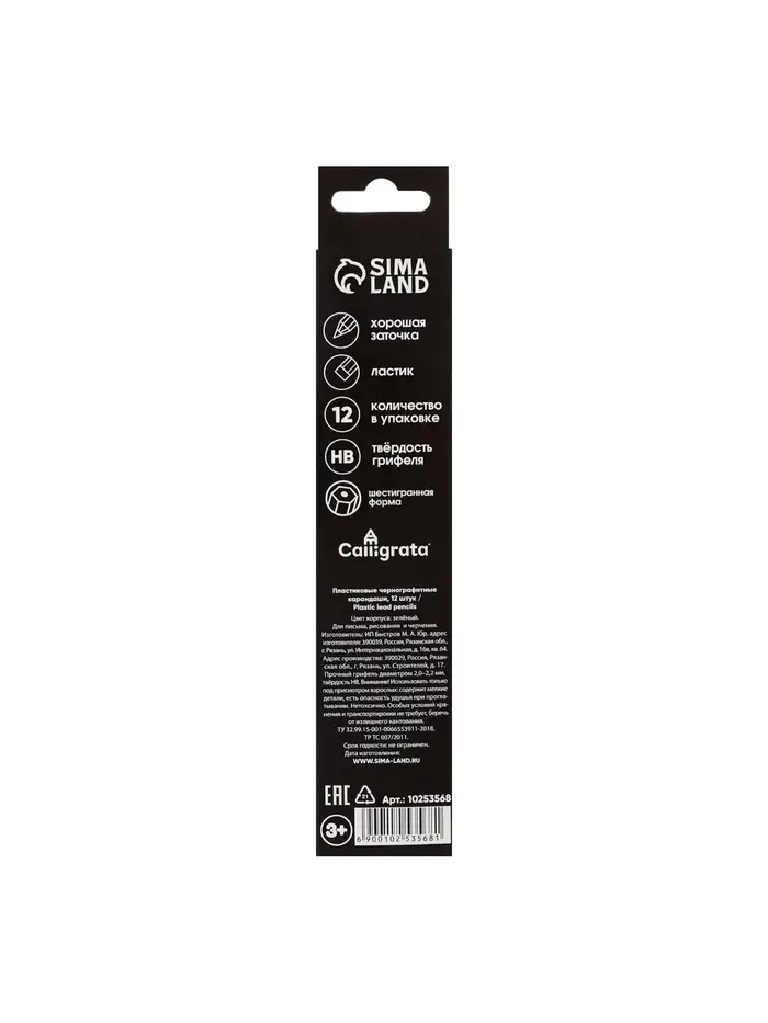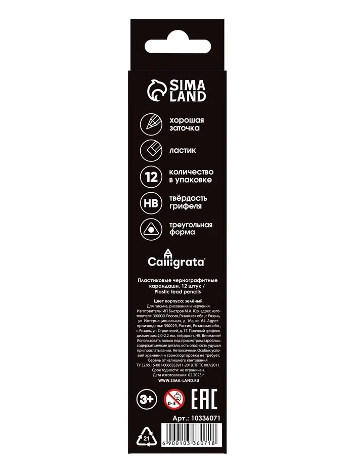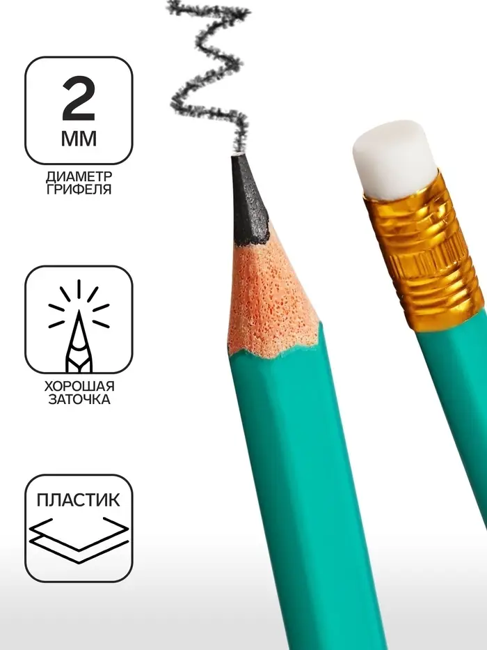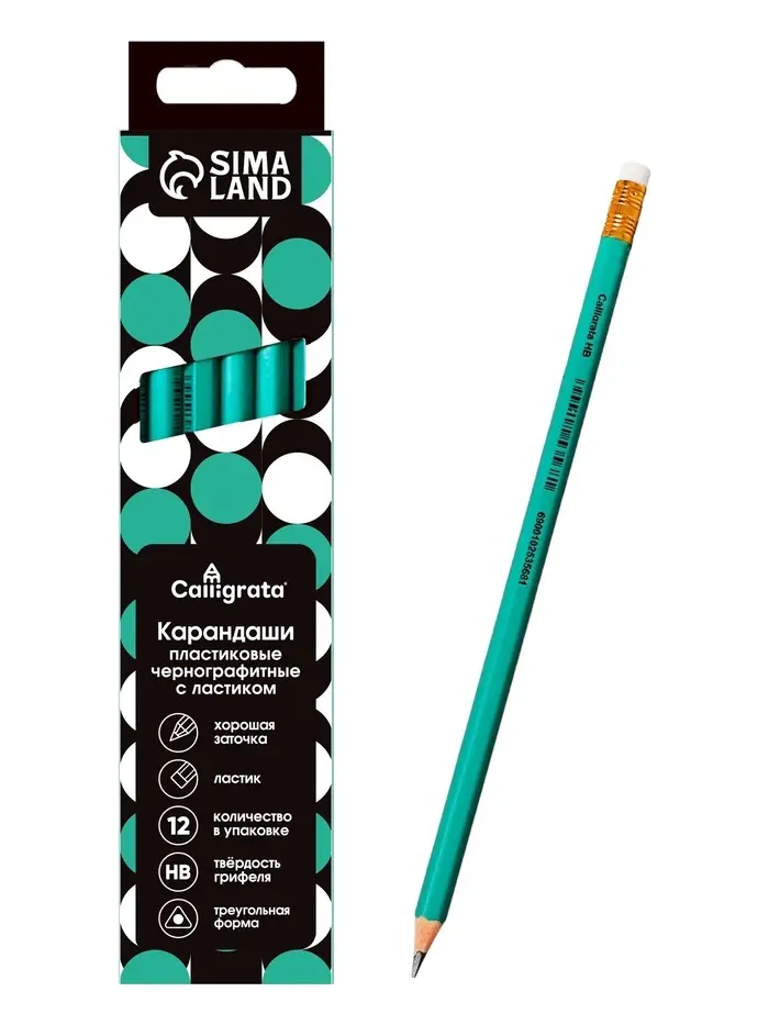 Набор карандашей чернографитных 12 штук, Calligrata Classic, с ластиком, заточенные, пластик, трехгранные, зеленые