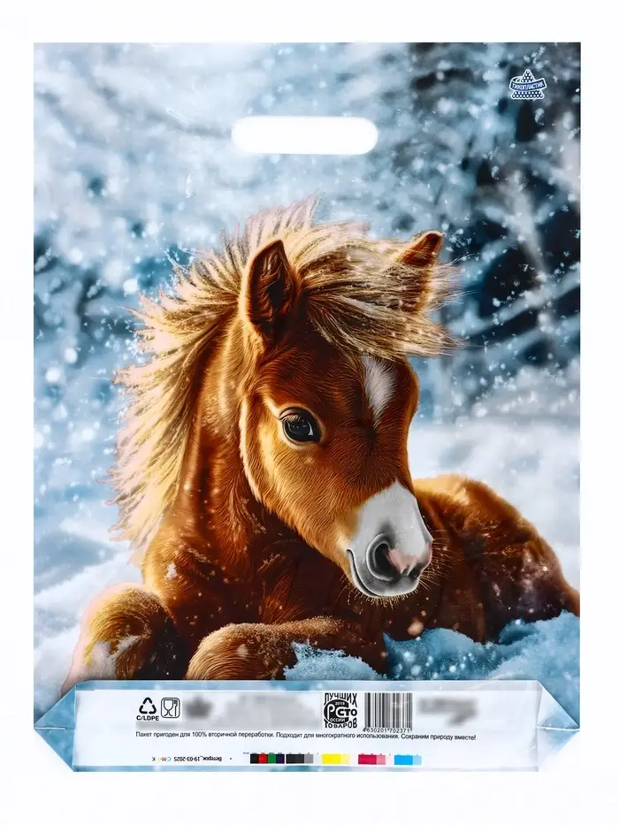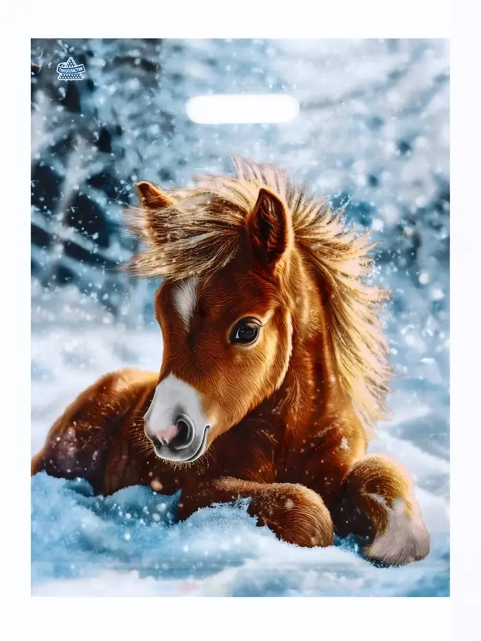 Зимняя сказка для новогодних подарков! Голубой подарочный пакет с лошадью (40×31 см) — это прочная упаковка с новогодним дизайном. Полиэтиленовый пакет с удобной вырубной ручкой выдерживает до 5 кг — идеален для детских подарков и праздничных сюрпризов.