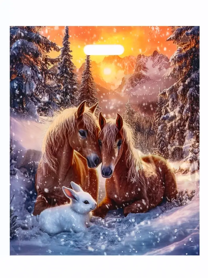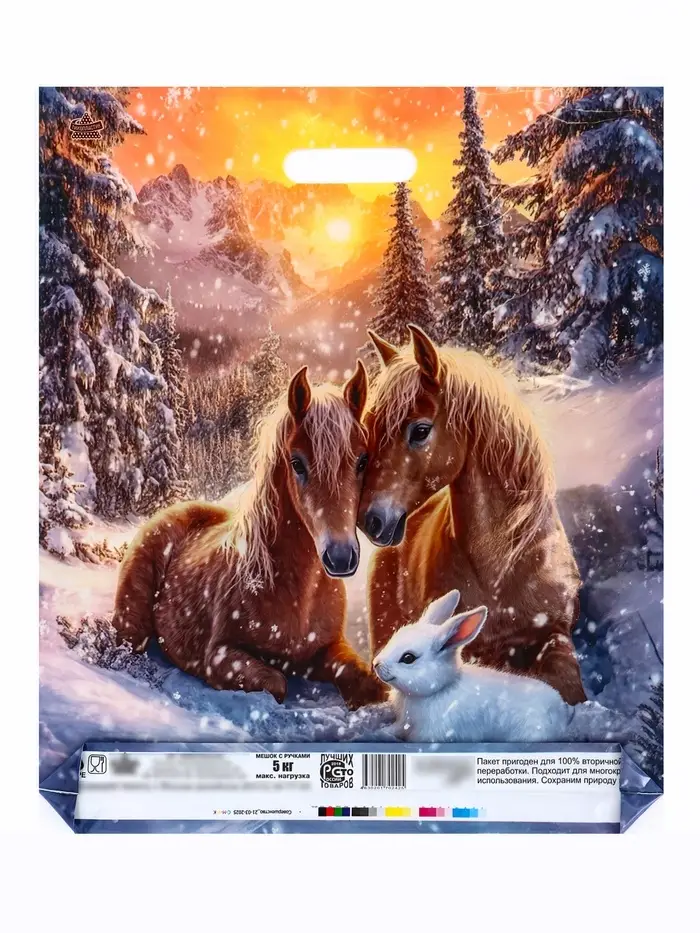 - Универсальный дизайн: Голубой фон с новогодней тематикой подходит для мальчиков, девочек и взрослых. Изображение лошади делает пакет актуальным подарком на 2026 год.