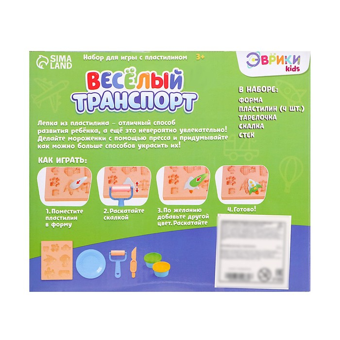 В комплект входит 5 баночек разноцветного пластилина, пресс-давилка, пресс-формочки, трафареты, а также посудка для игры.