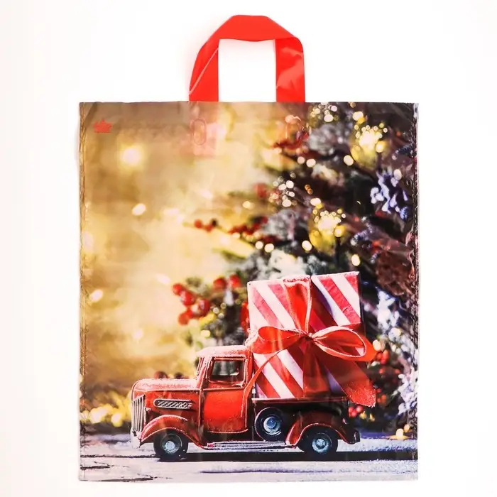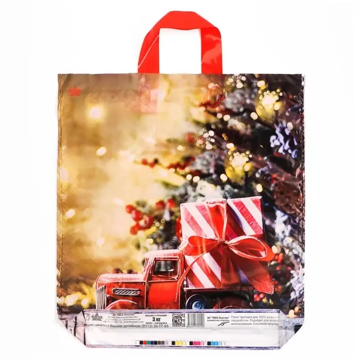 Пакет новогодний полиэтиленовый с петлевой ручкой имеет размеры 42 см в длину и 38 см в ширину. Толщина материала составляет 35 микрон, что обеспечивает его прочность и долговечность.