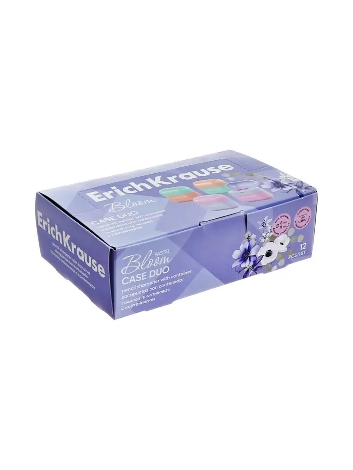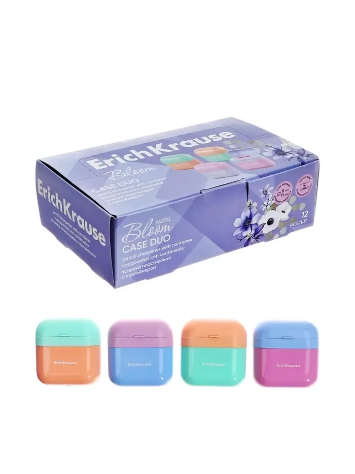 Точилка 2 отверстия с контейнером, ErichKrause Case Duo, Pastel Bloom, пластик, МИКС