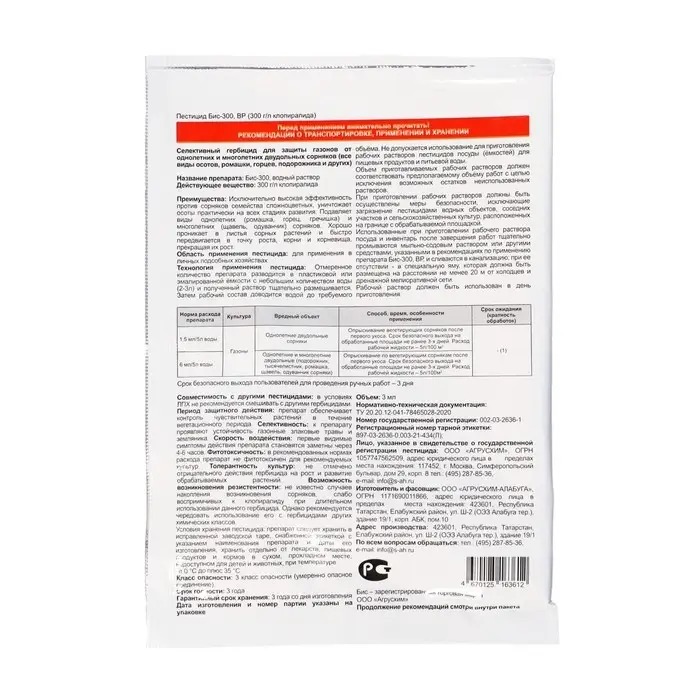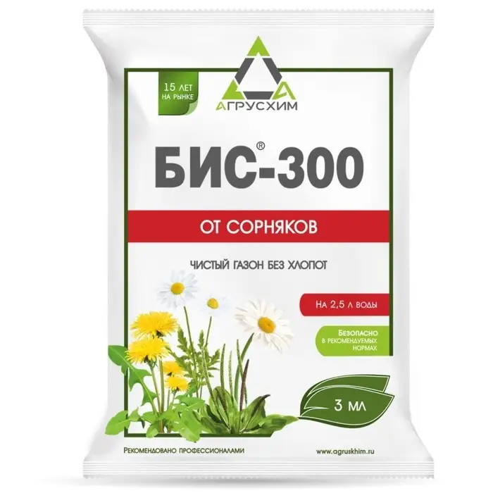 БИС-300 - уникальный гербицид для борьбы с однолетними и многолетними сорняками на газоне и посадках земляники в период вегетации.Обладает избирательным действием, подавляя только сорную растительность. Полностью уничтожает не только наземную, но и корневую систему сорняков.БИС-300 отличается исключительно высокой эффективностью в борьбе с осотом, ромашкой, горцами, одуванчиками, подорожником и пр., уничтожает сорняки на всех стадиях развития.Хорошо проникает в листья сорных растений и быстро передвигается в корневища, прекращая рост, и вызывая отмирание как надземной, так и подземной части сорняка.Идеален для поддержания в чистоте взрослых газонов. Период защитного действия: Оказывает гербицидное действие на чувствительные сорные растения в течении всего сезона. Гербицид избирателен к растениям сахарной свеклы, рапса ярового и озимого, льна-долгунца, кукурузы, газонным злаковым травам. Скорость воздействия: подавление роста сорняков происходит в течение нескольких часов после проведения обработки. Первые видимые симптомы действия препарата становятся заметны через 4-6 часов. Не фитотоксичен. Безопасность: Участок земли, с которого снята загрязненная почва, обрабатывают 3-5%-ным раствором кальцинированной соды и перекапывают. Загрязненную почву и пролитый препарат в контейнерах обрабатывают раствором хлорной извести и промывают водой. Обезвреживание отходов пестицида проводить путем обработки их 5 %-ным раствором щелочи или 7-10 %-ным раствором натриевой соли с последующим термическим обезвреживанием. Освободившуюся тapy промывают водой, обрабатывают раствором, ополаскивают водой, приводят в непригодное для повторного использования.Хранение при температуре от 0 °С до плюс 30 °С. Не допускается хранение препарата совместно с пищевыми продуктами, вдали от воздействия прямых солнечных лучей, попадания влаги, загрязнения и механического повреждения. Не допускается совместное транспортирование и хранение препарата с кормами и пищевыми продуктами.