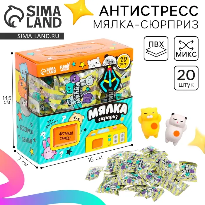 Мялка-сюрприз — это компактный и удобный способ справиться с напряжением и усталостью. Сжимайте и мните игрушку — она не потеряет своей первоначальной формы. Благодаря своей структуре и материалу, мялка поможет снять стресс и улучшить настроение.