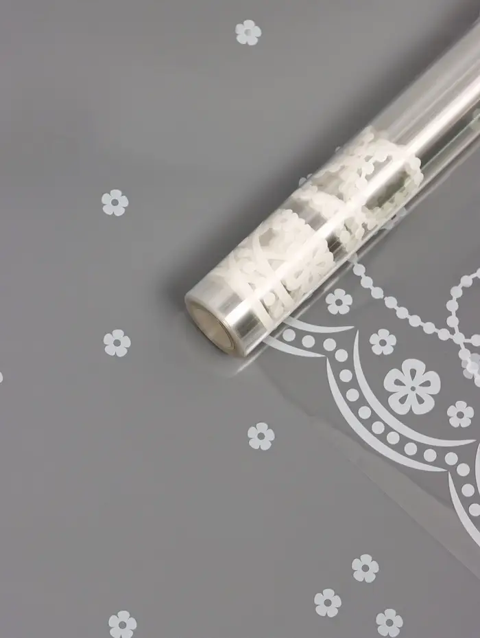- Элегантный дизайн: Белый рисунок с мотивами цветочных узоров добавляет утонченности любой обстановке. Прозрачная база плёнки придает легкость и воздушность любому декору.