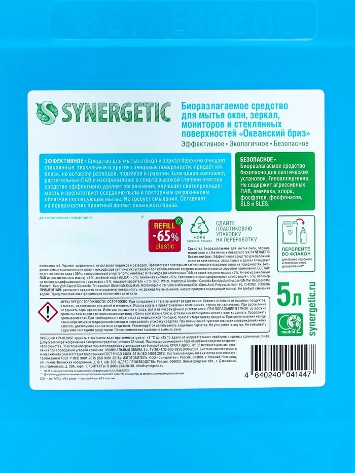 Средство для мытья окон и зеркал Synergetic «Океанский бриз», 5 л