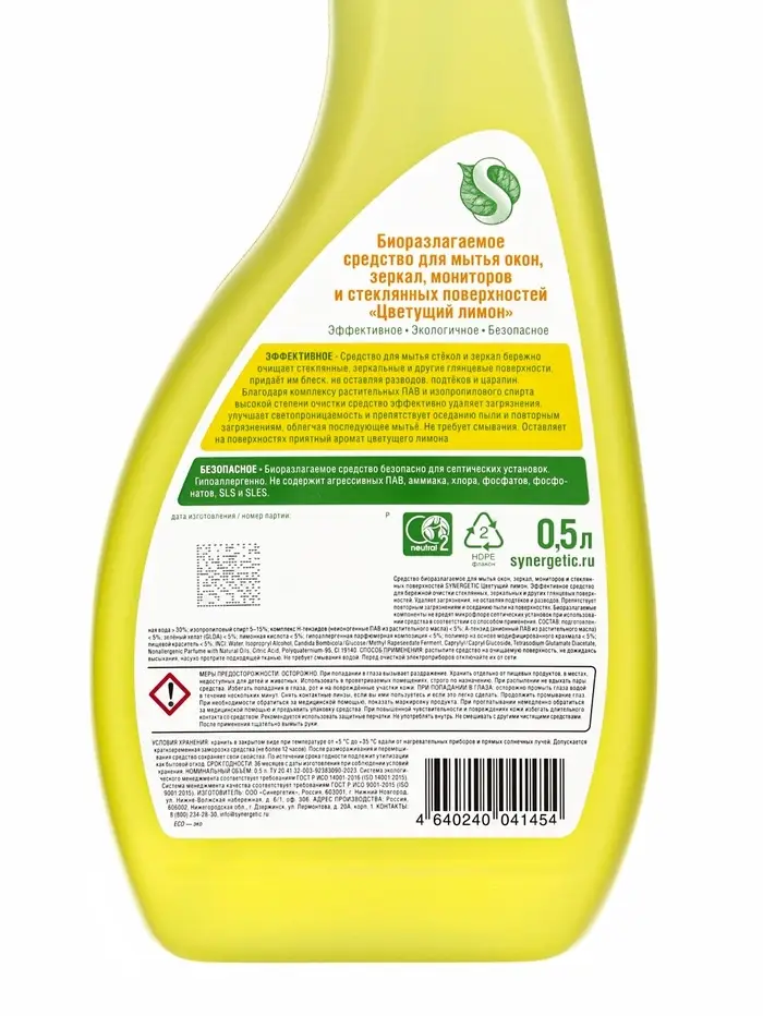 Средство для мытья окон и зеркал Synergetic «Цветущий лимон», 500 мл