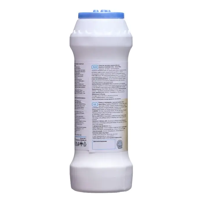 Способ применения: срезать шишечки на крышке. Чистящее средство насыпать на влажную поверхность или губку и растереть. Тщательно промыть водой.