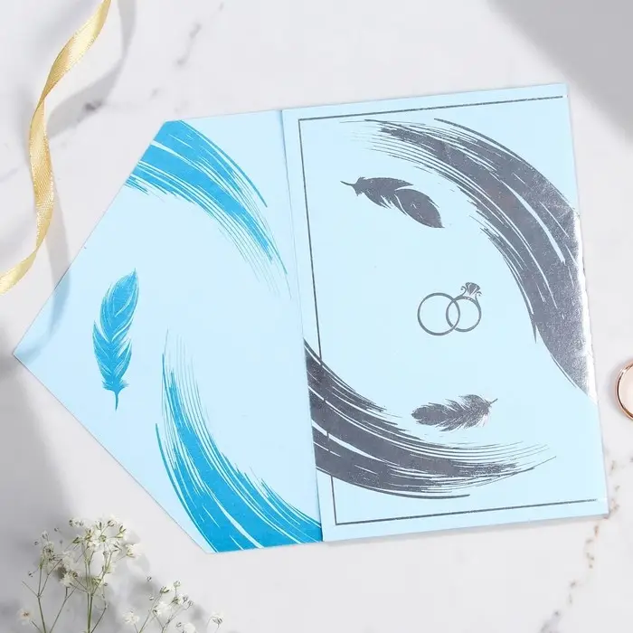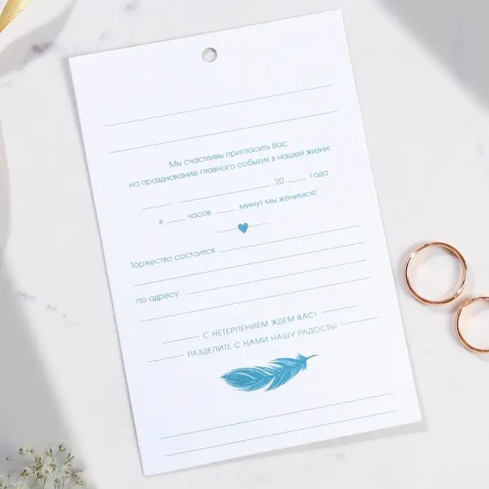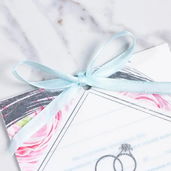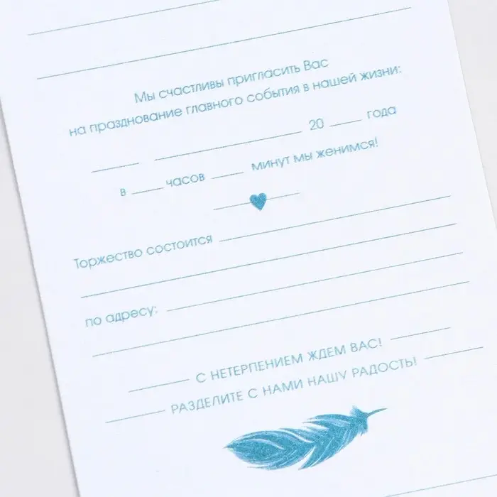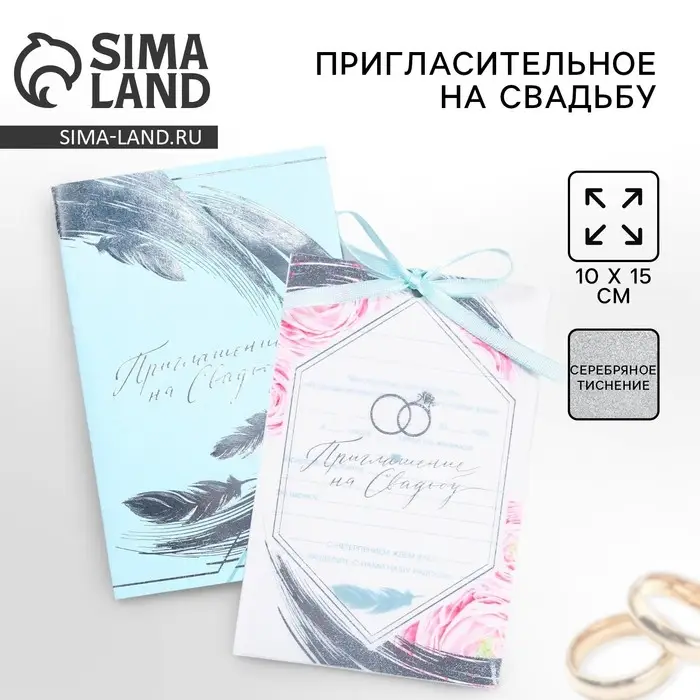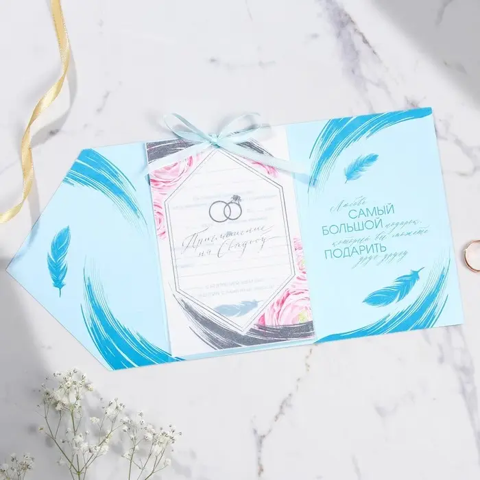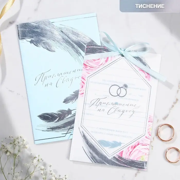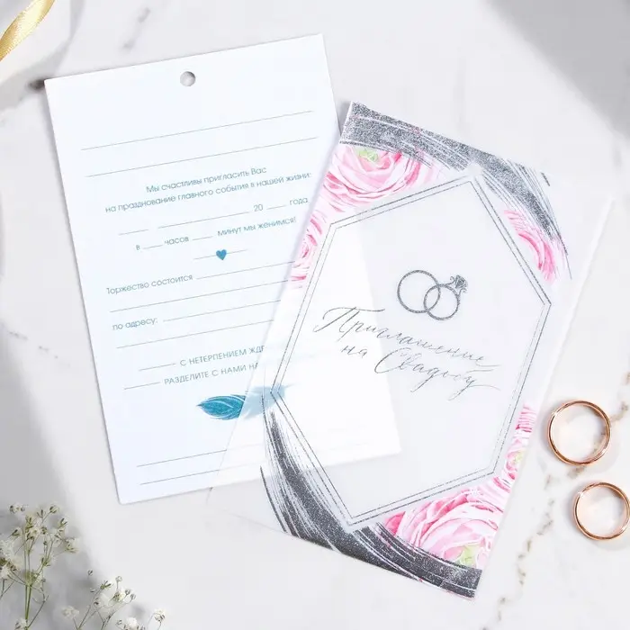 Когда дата и время бракосочетания уже известны, и вы определились со списком гостей, необходимо оповестить их о предстоящем празднике. Существует традиция делать персональные приглашения с указанием времени и даты мероприятия. Но перед свадьбой столько всего надо успеть, что на изготовление десятков открыток просто не остаётся времени. В этом случае вам придёт на помощь уникальное приглашение. Изделие выполнено из картона плотностью 250 грамм, калька плотностью 120 грамм, конверт из офисной бумаги плотностью 120 грамм и дополнено тиснением. Это придаёт дорогой и роскошный вид. Текст приглашения содержит свободные поля для имени адресата, времени, даты и адреса проведения мероприятия. Это потрясающее приглашение достойно стать частью такого важного события в жизни, как свадьба!