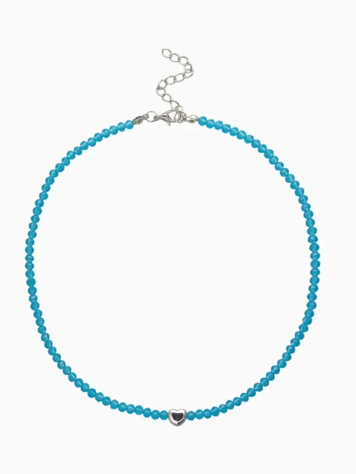 Голубой бисерный чокер с металлическим сердечком на серебристой основе — изящный аксессуар для женщин, ценящих лёгкость и выразительность в деталях. Регулируемая длина обеспечивает комфорт и точную посадку, подчеркивая линию шеи.