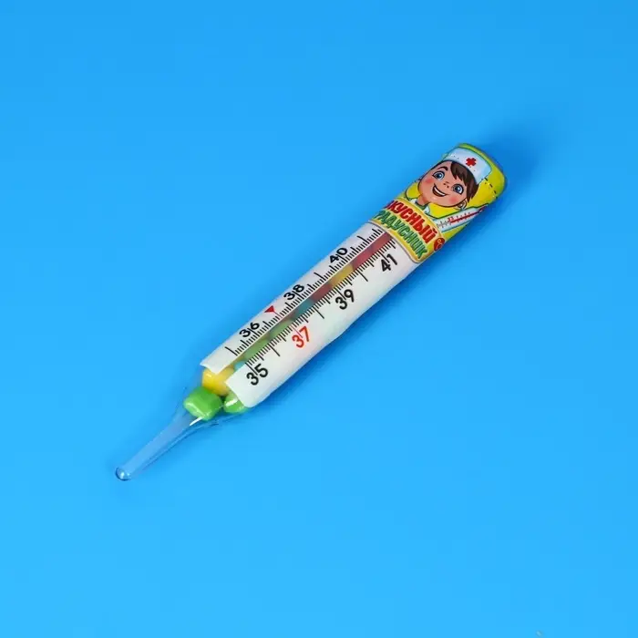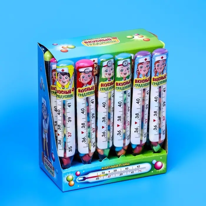 «Вкусный градусник» – это не только вкусное, но и забавное лакомство благодаря своему оригинальному дизайну, напоминающему градусник. Это делает её отличным выбором для детей и взрослых, которые хотят насладиться сладким угощением и добавить немного веселья в свой день. Наслаждайтесь разнообразием вкусов и оригинальным дизайном с жевательной резинкой «Вкусный градусник»!