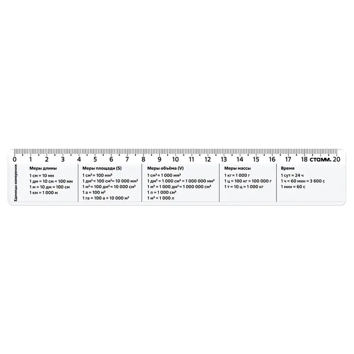 Линейка 20 см Стамм "Единицы измерения", со справочным материалом, пластиковая, прозрачная, бесцветная