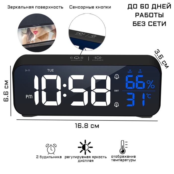 Часы настольные электронные с будильником, календарем, гигрометром и термометром представлены в современном минималистичном дизайне. Интерьерные часы станут прекрасным декором для дома и дачи, их можно поставить как на прикроватную тумбочку в спальне, детской комнате, гостиной так и на стол или на комод в зале, холле или на кухне. Часы настольные обладают громким будильником, ребенку и вам будет комфортно просыпаться, на работу и в школу. Будильник не требует частой замены батареек благодаря экономичному механизму.