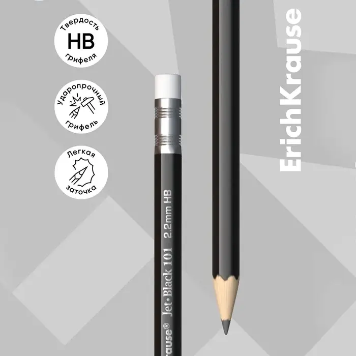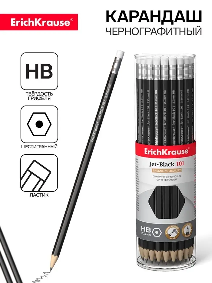 Карандаш чернографитный с ластиком Erich Krause «Jet Black 101», HB, грифель d=2.2 мм, дерево, шестигранный в тубусе, чёрный корпус
