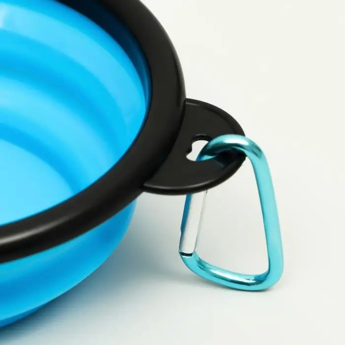 Миска имеет складную конструкцию, которая позволяет легко свернуть ее в компактный размер, удобно помещается в сумку или карман, также есть карабин, который позволяет легко прикрепить ее к рюкзаку, поясу или ошейнику вашего питомца.