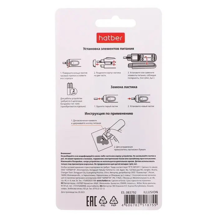 Ластик-карандаш электрический Hatber ILLUSION, со сменными насадками