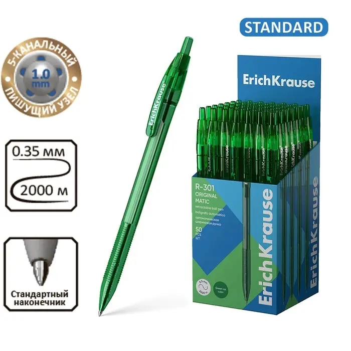 Ручка шариковая автоматическая ErichKrause R-301 Matic Original, узел 1.0 мм, чернила зелёные, длина линии письма 2000 метров