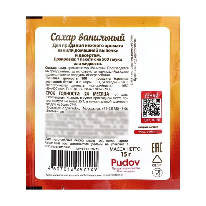 Состав: сахар белый, ароматизатор ванилин, ваниль натуральная измельченная. Может содержать следы глютена, сои, яиц, молока, орехов, арахиса, кунжута, сельдерея, горчицы.