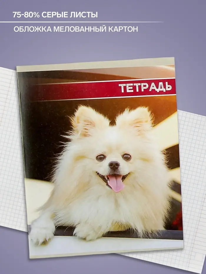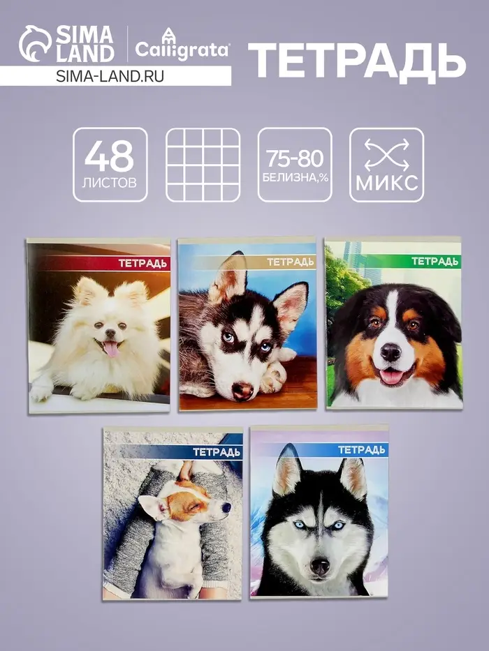 Тетрадь 48 листов в клетку Calligrata «Собачьи мордочки», обложка мелованный картон, блок №2, белизна 75% (серые листы), МИКС