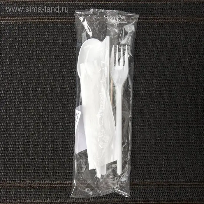 Набор пластиковых одноразовых столовых приборов 5 в 1: вилка, ложка, нож, салфетка, зубочистка, цвет белый