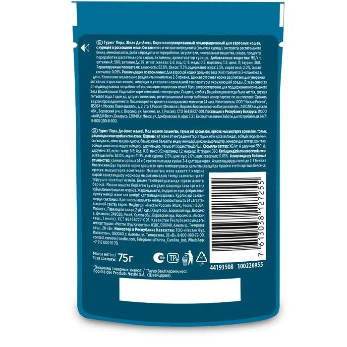 Состав:мясо и мясные ингредиенты (включая курицу), экстракты растительного белка, аминокислоты, рыба и продукты ее переработки, загустители, минеральные вещества, сахара, продукты переработки растительного сырья, витамины, ароматизатор курицы.