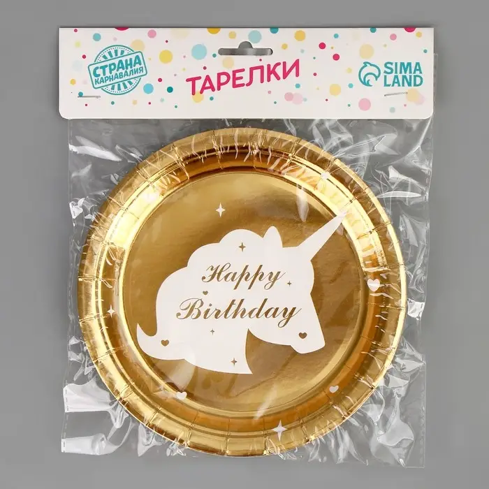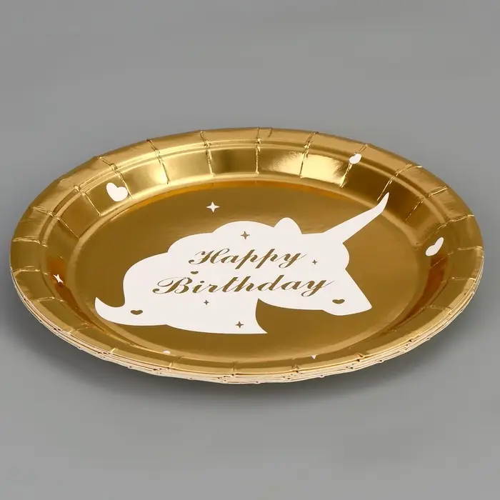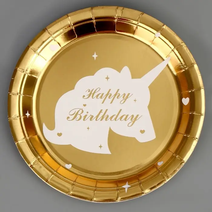 Тарелка бумажная одноразовая «С днём рождения. Единорог», 6 шт., золотая