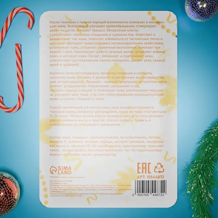 Новогодняя маска для лица, тканевая, увлажняющая, с ароматом пряной корицы