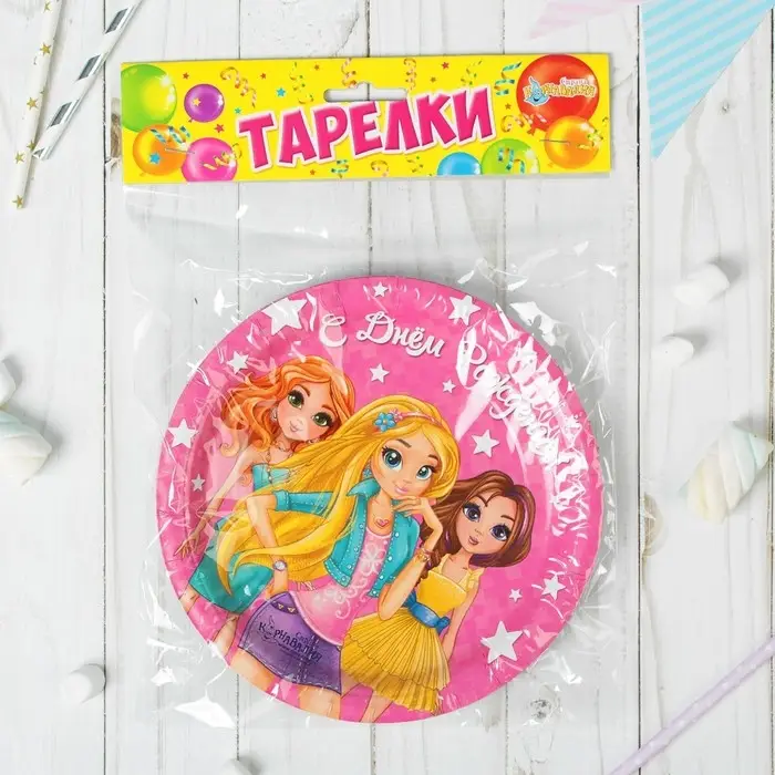 Тарелка одноразовая бумажная "С Днем рождения" двчонки (набор 6 шт) 18 см